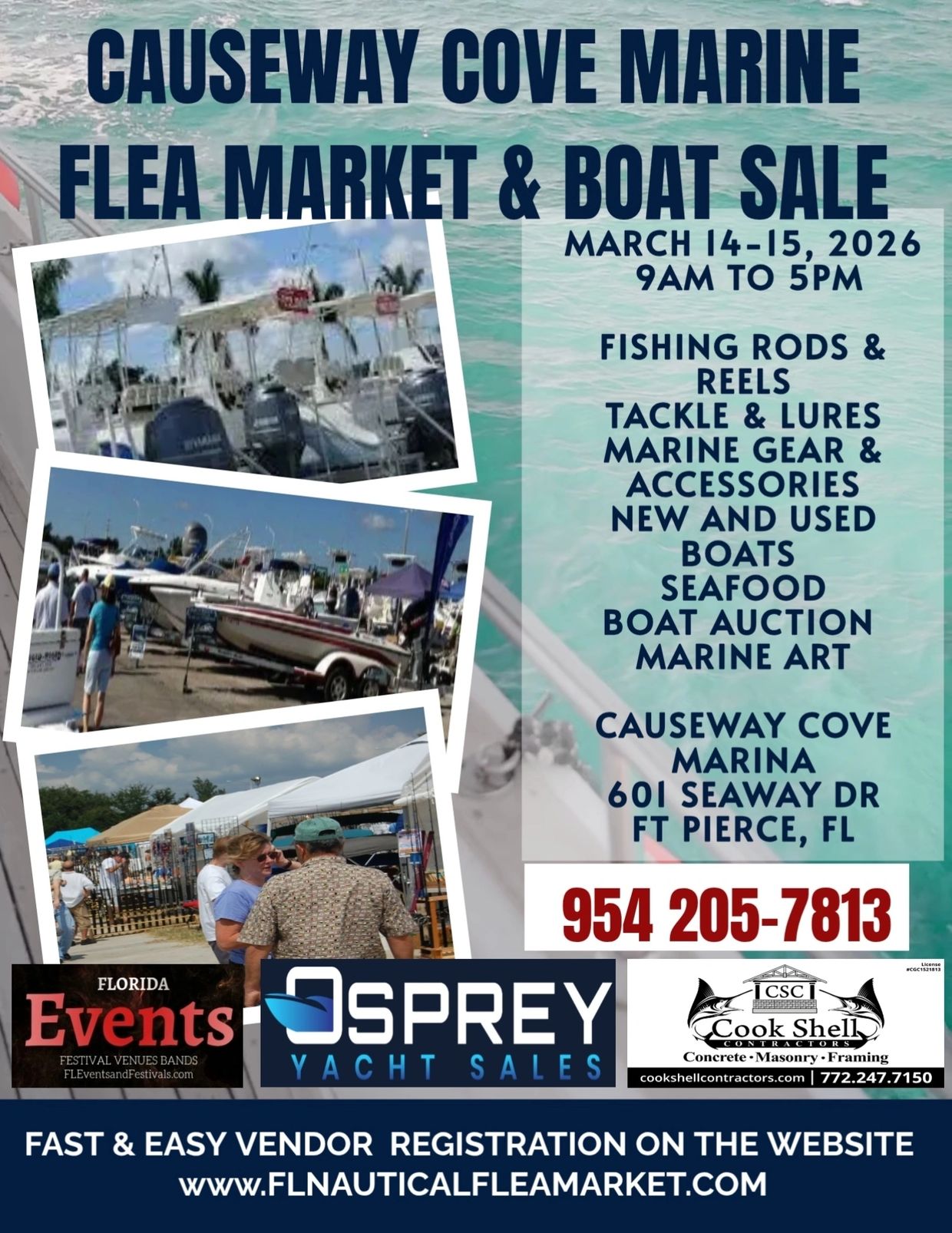 Join us at the Festival of the Sea, March 14-15, 2026, at Causeway Cove Marina in Ft. Pierce, FL! Enjoy new boats, marine flea market, seafood, live music, kids' activities, and more. Fun for the whole family!