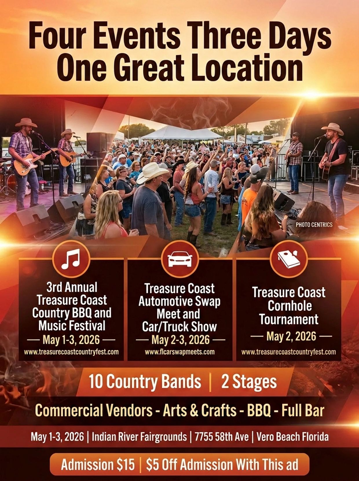 VERO BEACH, FL β The 3rd Annual Treasure Coast Country BBQ & Music Festival is back and better than ever! Scheduled for May 2-3, 2026, at the Indian River Fairgrounds in Vero Beach, this much-anticipated event is now accepting applications from BBQ, Arts & Crafts, commercial vendors and country bands. Donβt miss your chance to be part of one of Floridaβs most exciting celebrations of country music, barbecue, and community spirit!
