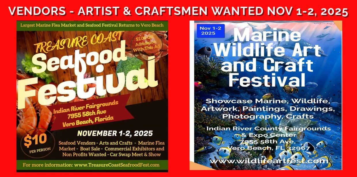 Calling all seafood lovers and art aficionados! The highly anticipated Treasure Coast Seafood Festival, featuring a Marine & Wildlife Art and Craft Festival, will return to the Indian River Fairgrounds in Vero Beach, Florida, on Saturday and Sunday, November 1-2. 2025, from 9 AM to 5 PM.